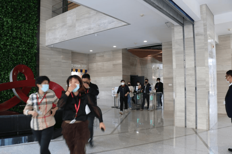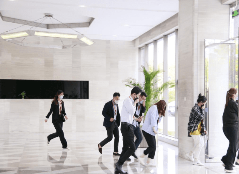 與此同時(shí),應(yīng)急廣播在接到“火情”第一時(shí)間響起,相關(guān)樓層員工聽到廣播在安全員的指揮引導(dǎo)下,快速有序地集體撤離至安全集合點(diǎn),由相關(guān)負(fù)責(zé)人統(tǒng)計(jì)清點(diǎn)人員。